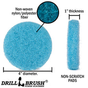 4 Inch Diameter attaches to backer pad (sold seperately) with Velcro Comes in a Pack of Four Soft Pad For Polishing and Light Scrubbing Ideal For Glass,Plastics and Fiberglass Medium Size is Ideal For Household Cleaning Questions? Call Drillbrush.com at: 315-527-1817 All our products ship the SAME DAY via USPS Priority mail direct from our warehouse for only $3.95 (flat rate) on any size order located at 9809 River Road Marcy NY 13403 Visit our Frequently Asked Questions page for the answers to popular questions about our products. Do you have other questions about our brushes or your application? call Tony at 315-527-1817